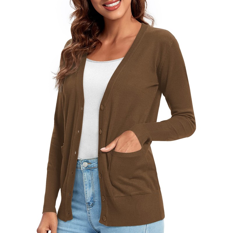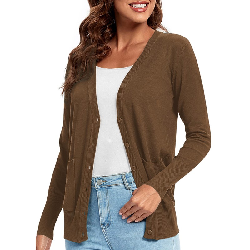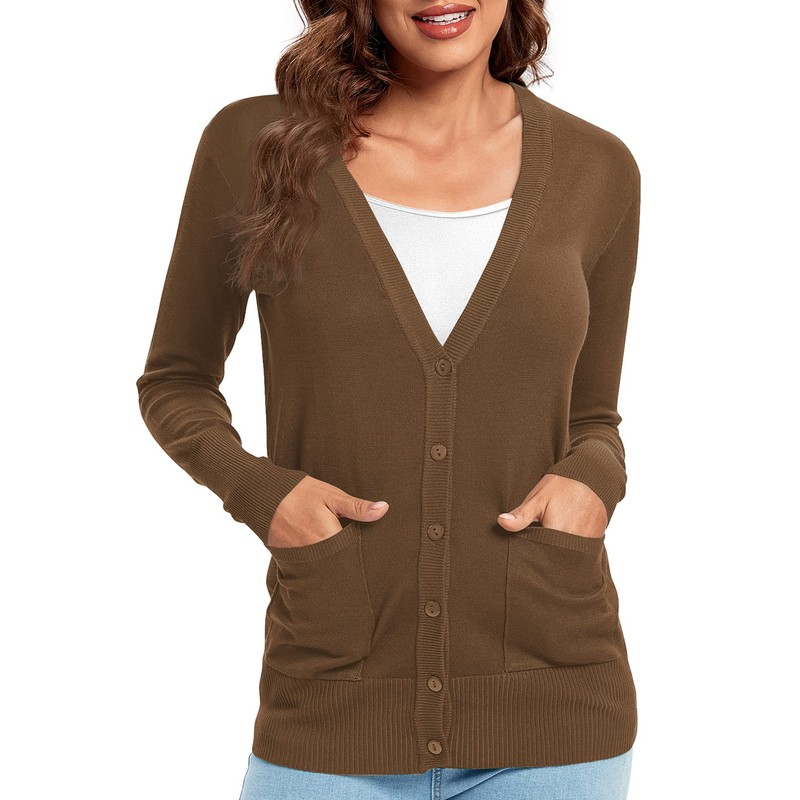 Urban CoCo Women's Button Down Lightweight Knit Cardigan Sweater with Pockets (M, Brown)