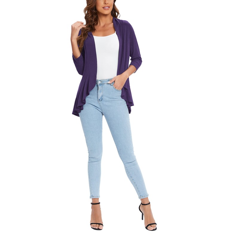 Urban CoCo Women's Casual Lightweight Open Front Cardigan Soft Draped Ruffles 3/4 Sleeve (Purple, l)