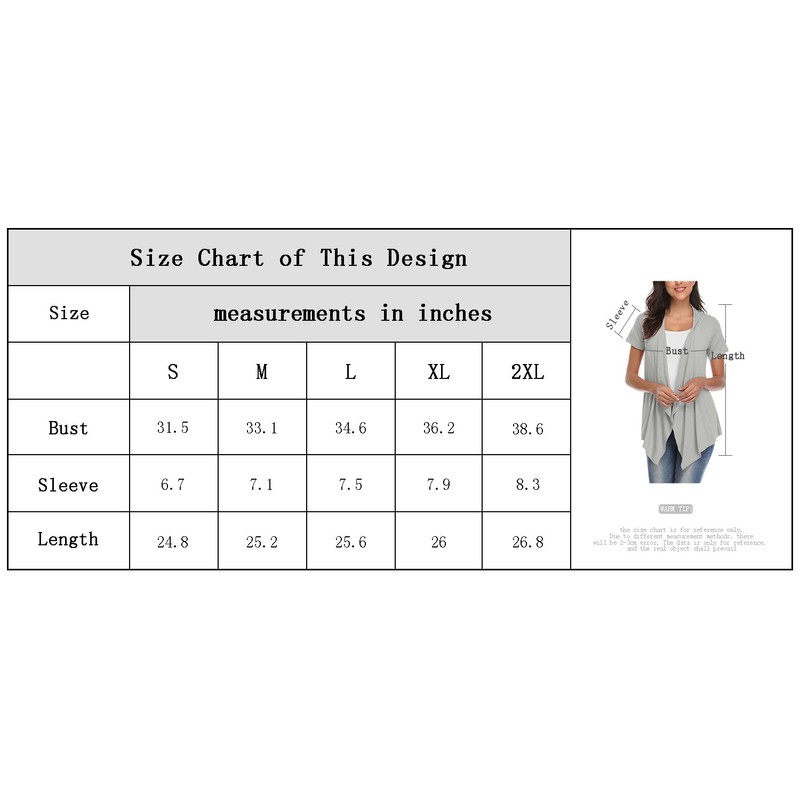2XL:Bust:38.6"---Sleeve:8.3"---Length:26.8"