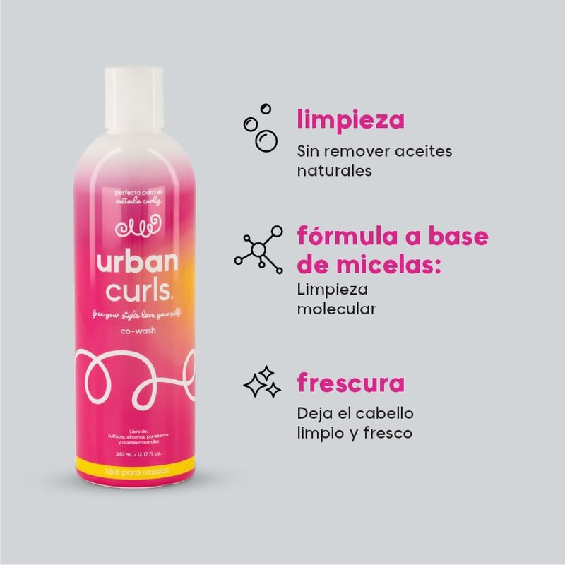 URBAN CURLS, Co-Wash, Complemento de shampoo para Definir Rizos Libre de Sulfatos, Prabenos, Siliconas y Aceites Minerales, sin sal 360 ml