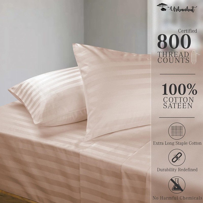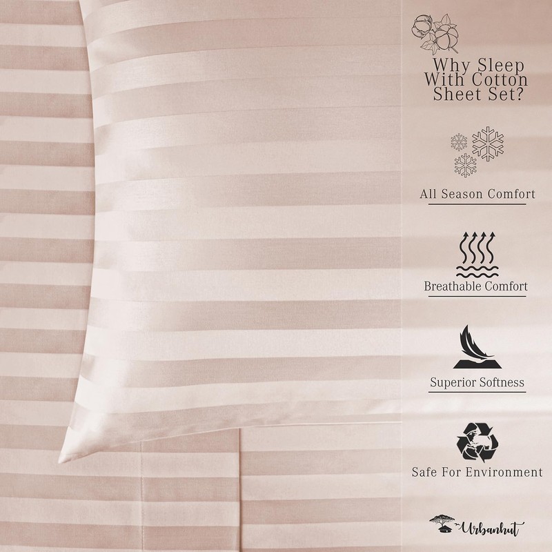 URBANHUT 800 Thread Count Egyptian Cotton Damask Striped Queen Size Sheets Set (4 Pc) - Ultra Soft & Smooth, Sateen Weave Queen Size Sheets, Luxury Hotel Sheets with 16" Deep Pocket - Blush Pink