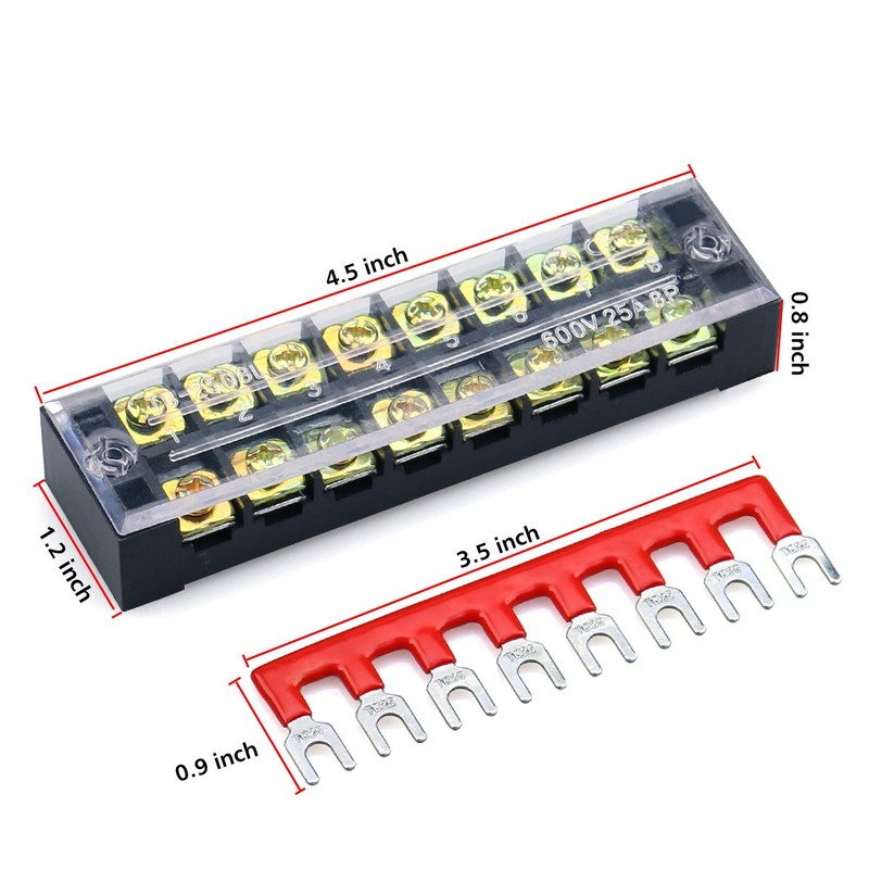 - Terminal Block Species: Material:Copper,Plastic, Position:8(Dual Row), Size:115 x 30 x 19mm/ 4.53" x 1.18" x 0.75"