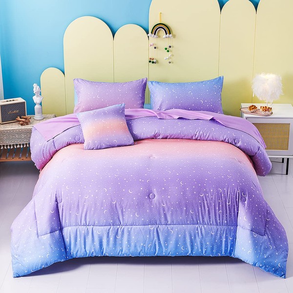 URBONUR Girls Comforter Set Twin 6PCS Gradient Purple Orange Glitter Moon Star Printed Bed in A Bag Soft Breathable Fluffy Bedding Set for All Season (Star, Twin Size)