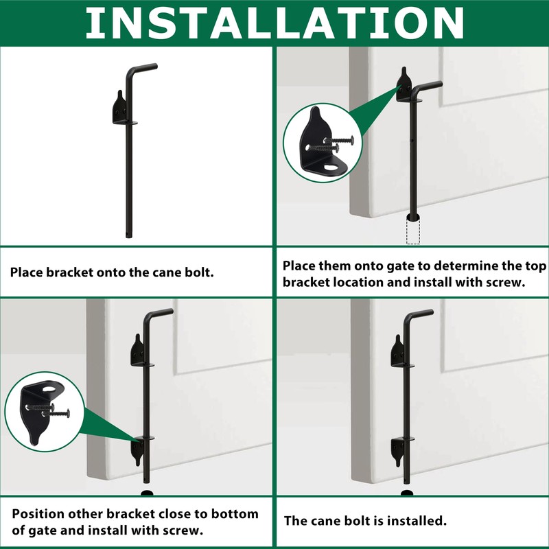 - [Unlimited Installation]The gate cane bolt installation is not limited by direction. 12 inch gate latch designed for vertical or horizontal heavy-duty wooden gates, fences and doors. With the upper ear on the rod, prevent the bolt gate latch from slipping out when installed horizontally.