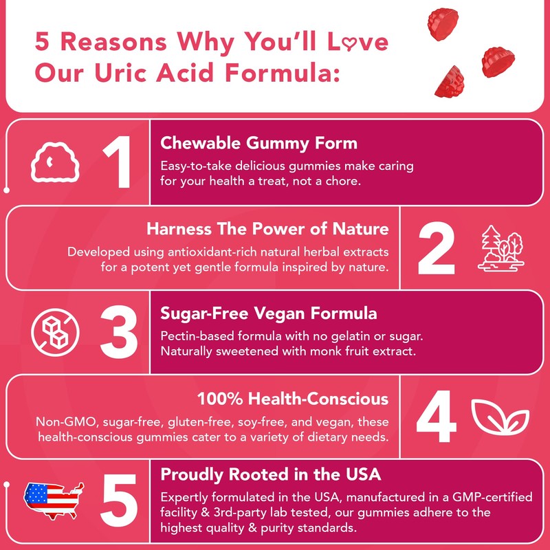 Quality is our top priority. Our uric acid supplement gummies are meticulously formulated in the USA, manufactured in a GMP-certified facility, and thoroughly 3rd-party lab tested for purity and potency.