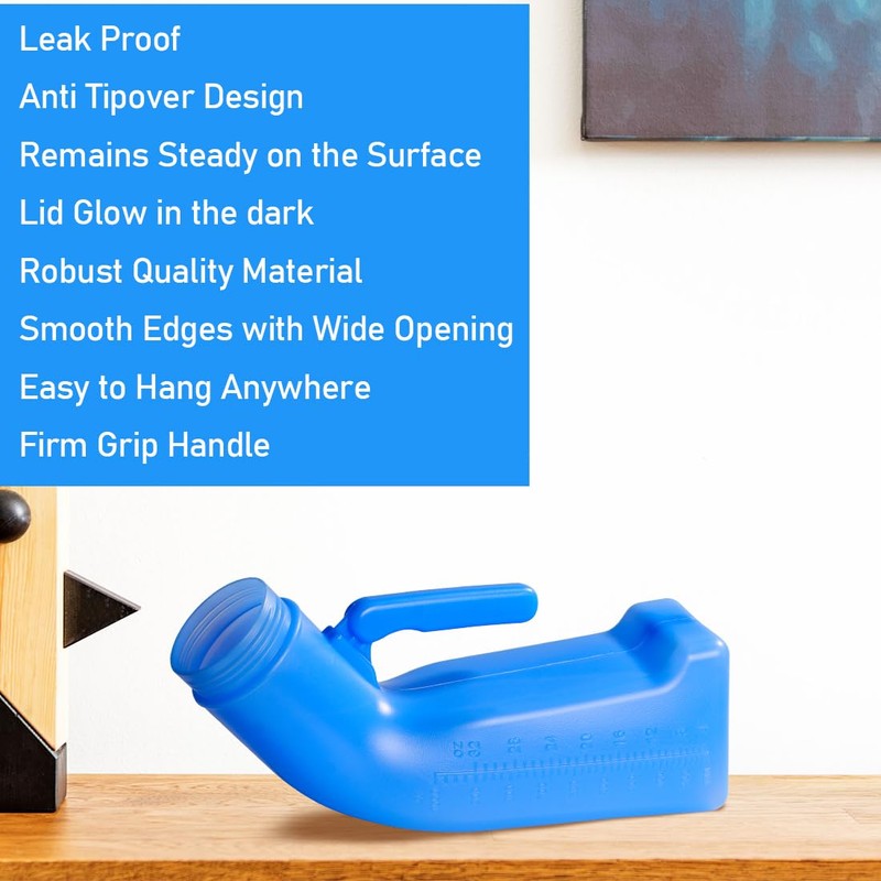 - Portable Urine Bottle: The hand-held male pee bottle is easy to carry anywhere, and the blue bottle body with easy-to-read graduated scale, can provides instant bladder relief for men when on the go or at home.