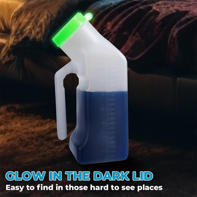 - Glow in Dark: Travel plastic pee bottles has a fluorescent screw lid, which will glow in the dark, making it easier to find the urinal at night