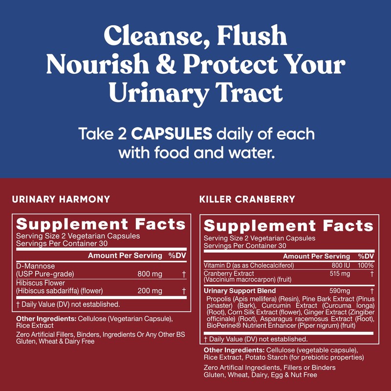 - CLINICALLY TESTED INGREDIENTS: D-Mannose and Hibiscus Extract to cleanse your urinary tract from unwanted bacteria, promote proper pH balance and support long-term urinary and bladder wellness (Urinary Harmony) PLUS 9-ingredient blend crafted with cranberry extract, French maritime Pine Bark Extract, Propolis & Vitamin D to soothe symptoms and help protect & defend the urinary tract (Killer Cranberry).