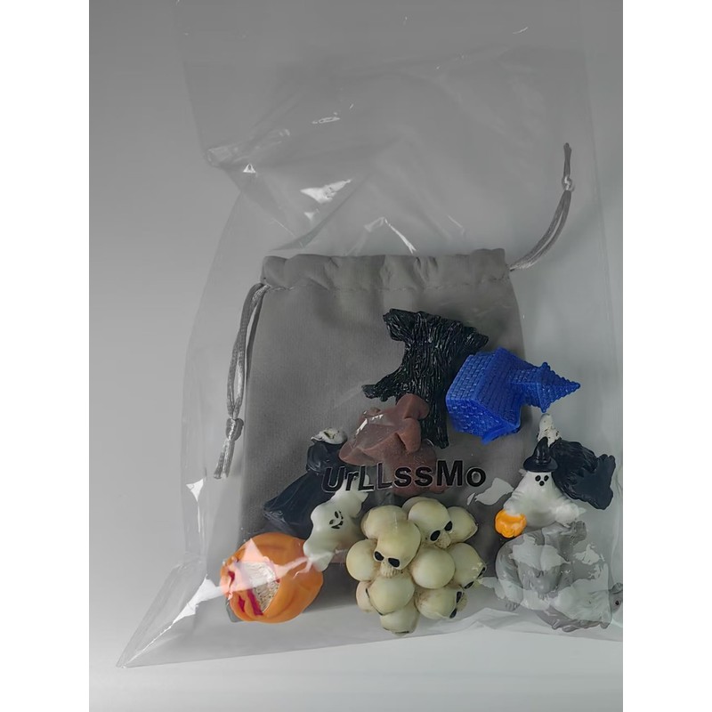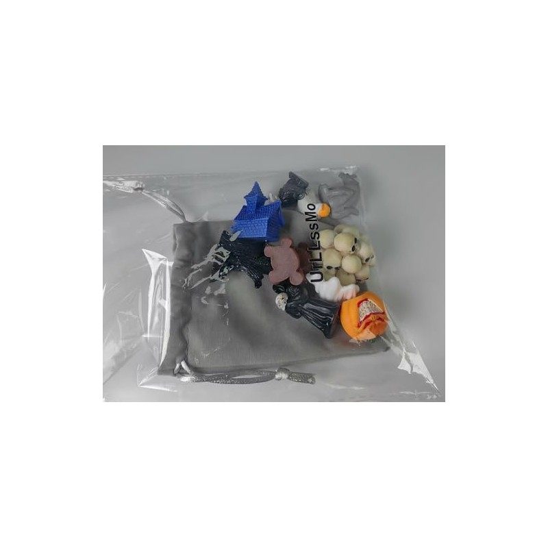 UrLLssMo Halloween Decorative Figurines Set with Haunted House, Skulls, Ghosts, and Pumpkin, Gray Drawstring Bag