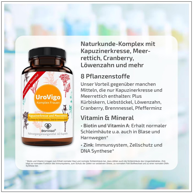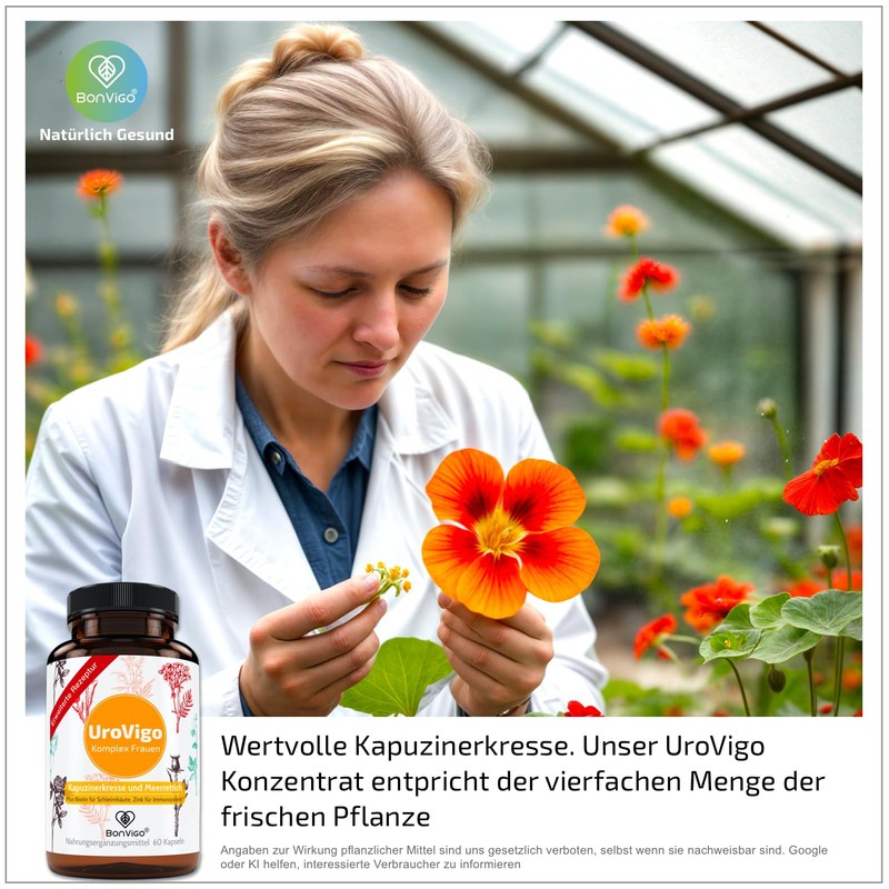- Capsules for women. UroVigo brings two worlds together. Orthomolecular active ingredients with scientific expertise are embedded in a rich 8-plant complex according to the findings of natural science. The micronutrients are thoroughly researched, their effect is confirmed by EU authorities