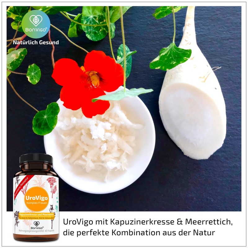 - Urovigo convinces with a wide natural selection of plants, the mustard oil of nasturtium is particularly important to us. We extend the well-known combination of nasturtium and horseradish to include pumpkin seed, cranberry, lovage, dandelion, mint, nettle. The formula thus pursues a fundamentally different concept than frequently offered remedies with D-mannose sugar