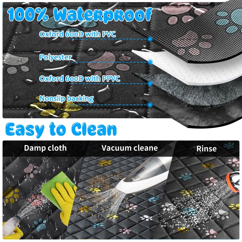 - Waterproof & Easy to Use: Made of 4-layer durable materials like 600D Oxford, the dog seat cover is waterproof, and scratch-resistant to protect your car from spills, scratches, and dirt. It is easy to install or remove the dog back seat cover, and easy to clean with a damp cloth or vacuum. It's a must-have accessory for any pet owner on the go.