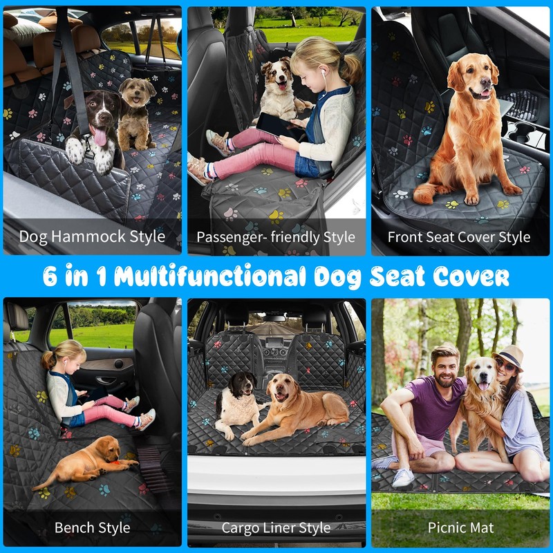 - 6-in-1 Multifunctional Dog Seat Covers for Car: It can be converted into 6 styles, including Dog Hammock for Car, Passenger-friendly Style, Dogs Front Seat Cover, Bench Back Seat Cover, Trunk Cargo Liner, and Picnic Mat. Whether you're going on a camping trip, beach day, or just a quick ride to the vet, there's a style that suits your needs.