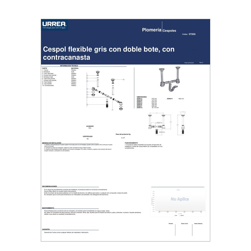 Urrea 3735G Céspol Flexible Doble con Bote Grande y Contracanasta, Trampa para Fregadero Doble, Desagüe para Cocina, Plástico
