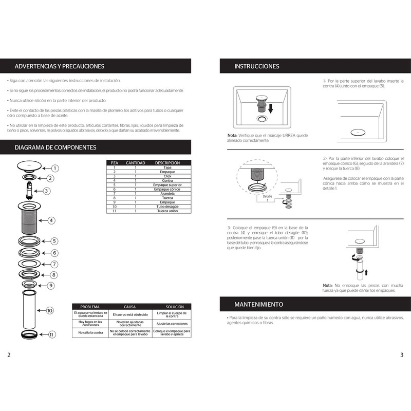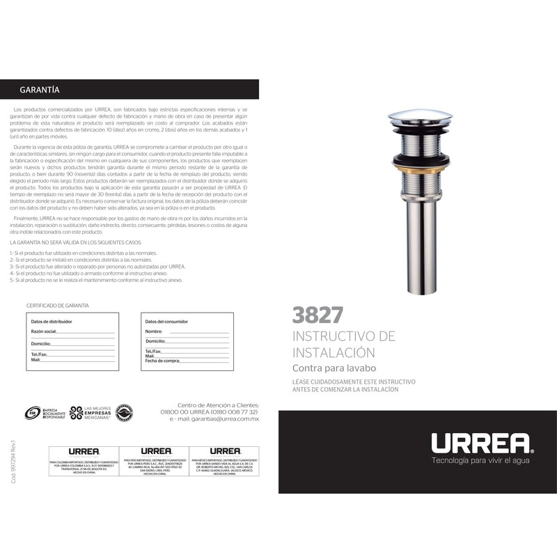 Urrea 3827 Contra Push sin Rebosadero para Lavabo, Acabado Cromo