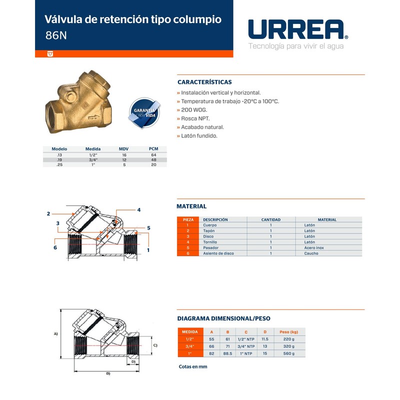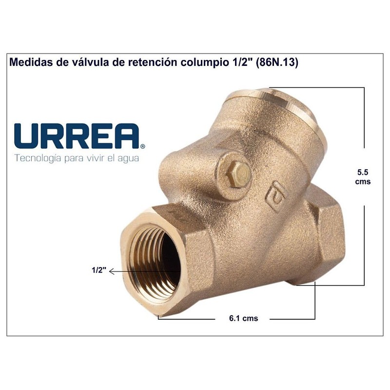 URREA 86N.13 Válvula de Retención de Columpio de ½”, Válvula check