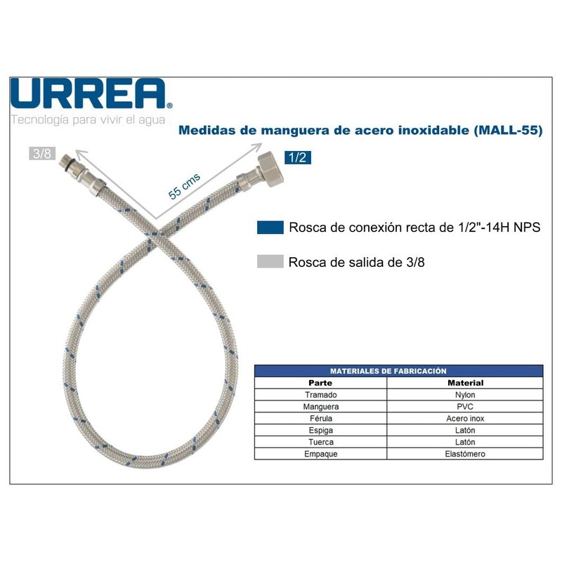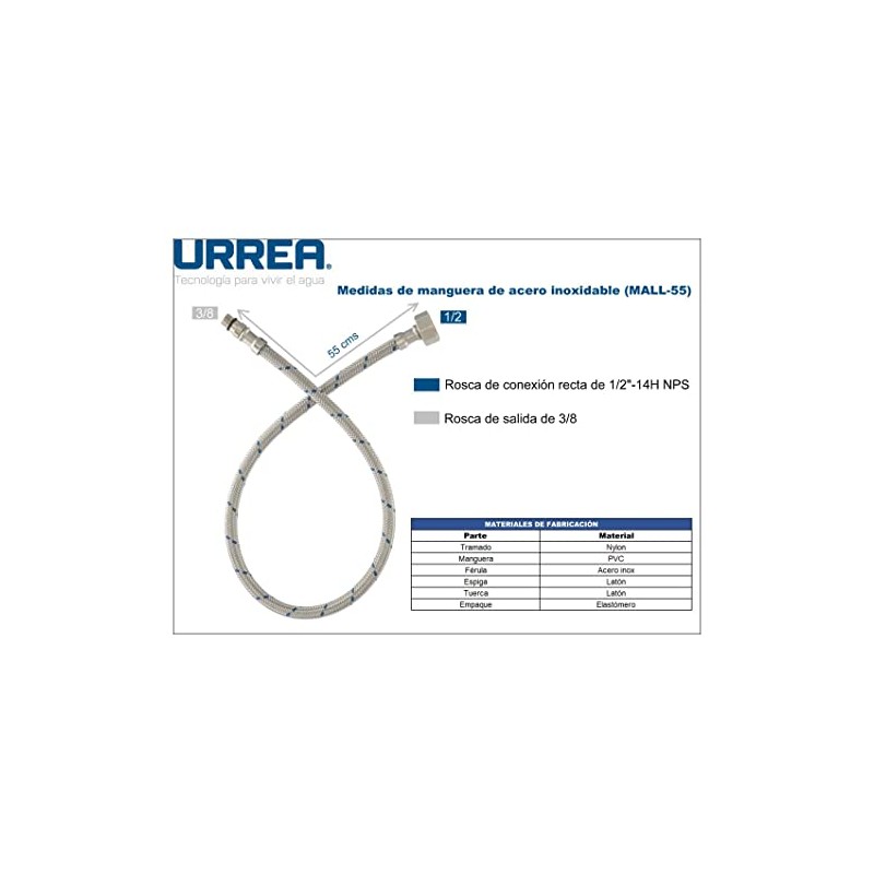 - Manguera: Esta es una manguera flexible que conduce el agua limpia de la tubería hacia la mezcladora o llaves de fregadero. La medida estándar para las mangueras de fregadero es de 55cm de largo. Fácil instalación por sus tuercas.