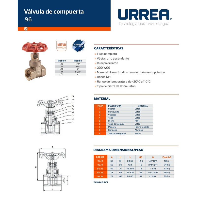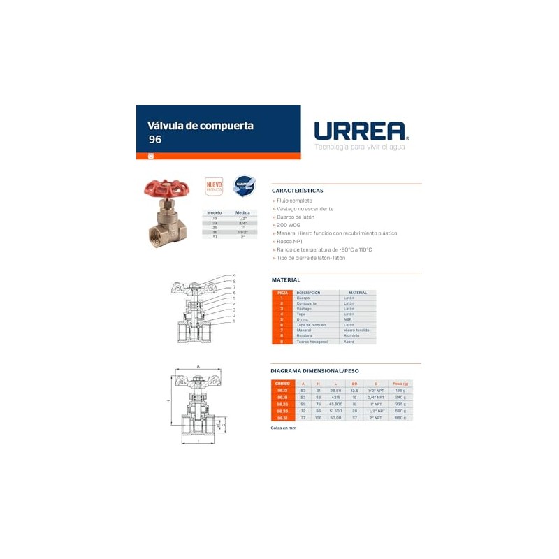 URREA Válvula de Compuerta Roscable 1/2", 96.13
