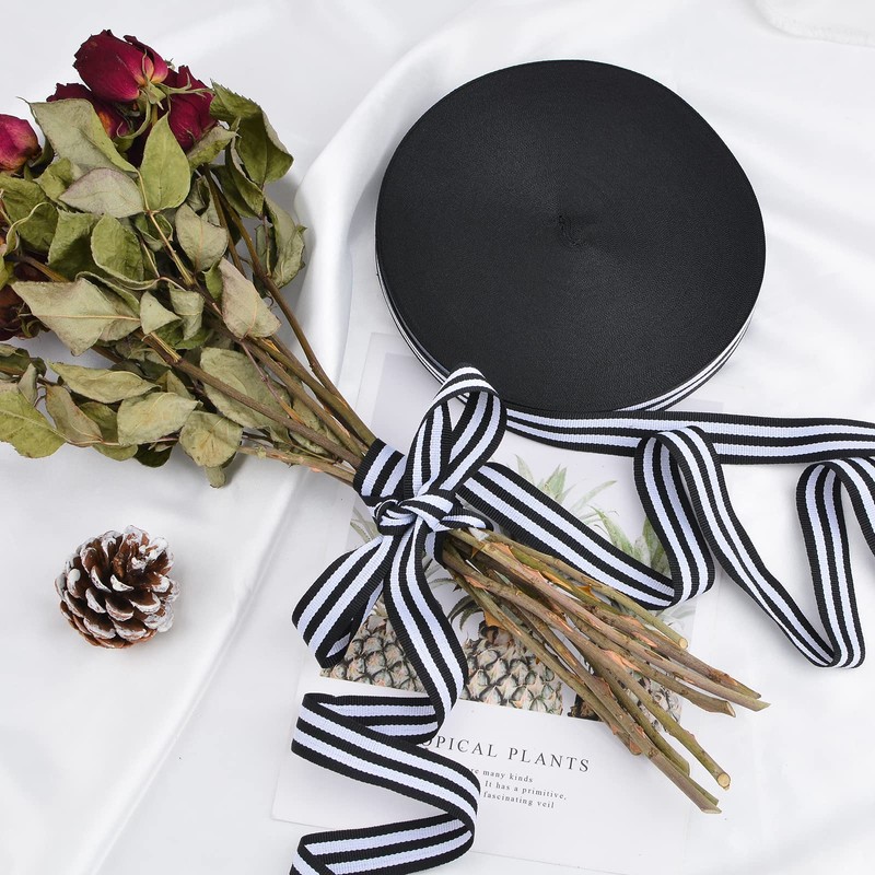 PACKAGE INCLUDES 1 roll of double-sided black and white striped ribbon, 50 yards long and 0.8 inches wide. You can cut the ribbon to the desired length.