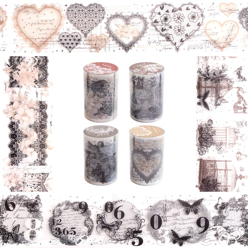 - Package Included The vintage clear tape set includes 4 rolls of different patterns, each tape is 6 x 2.18 m long and 6 cm wide, made of PET material. This material is durable, not easy to fade and has waterproof properties to ensure the service life and quality of the product.