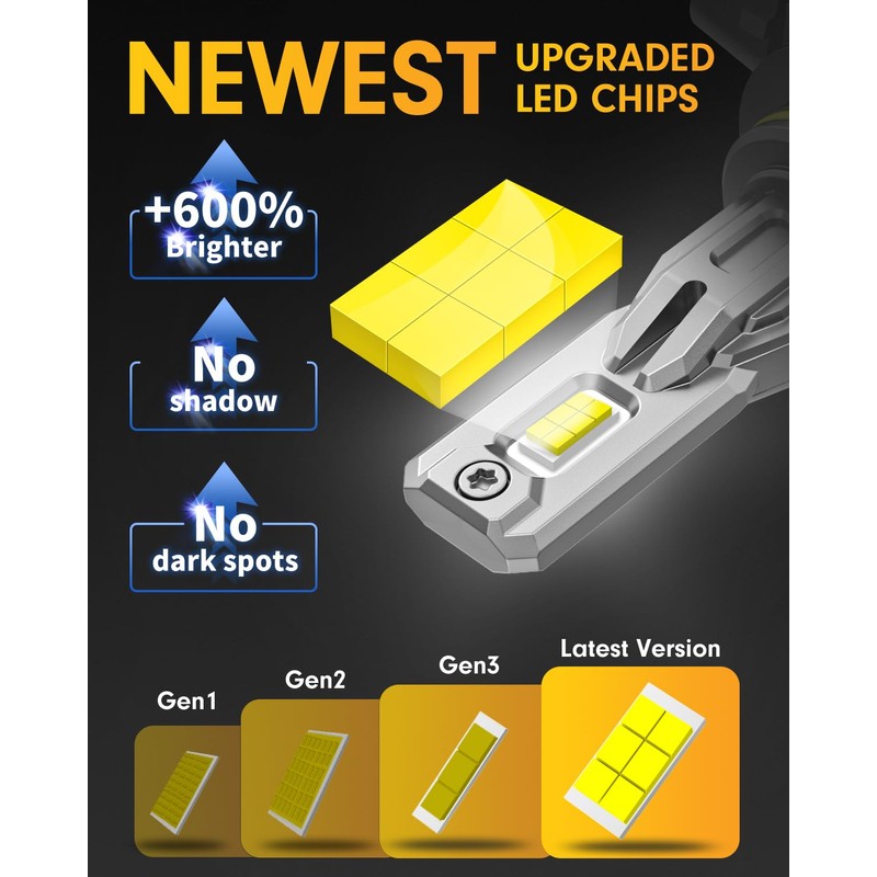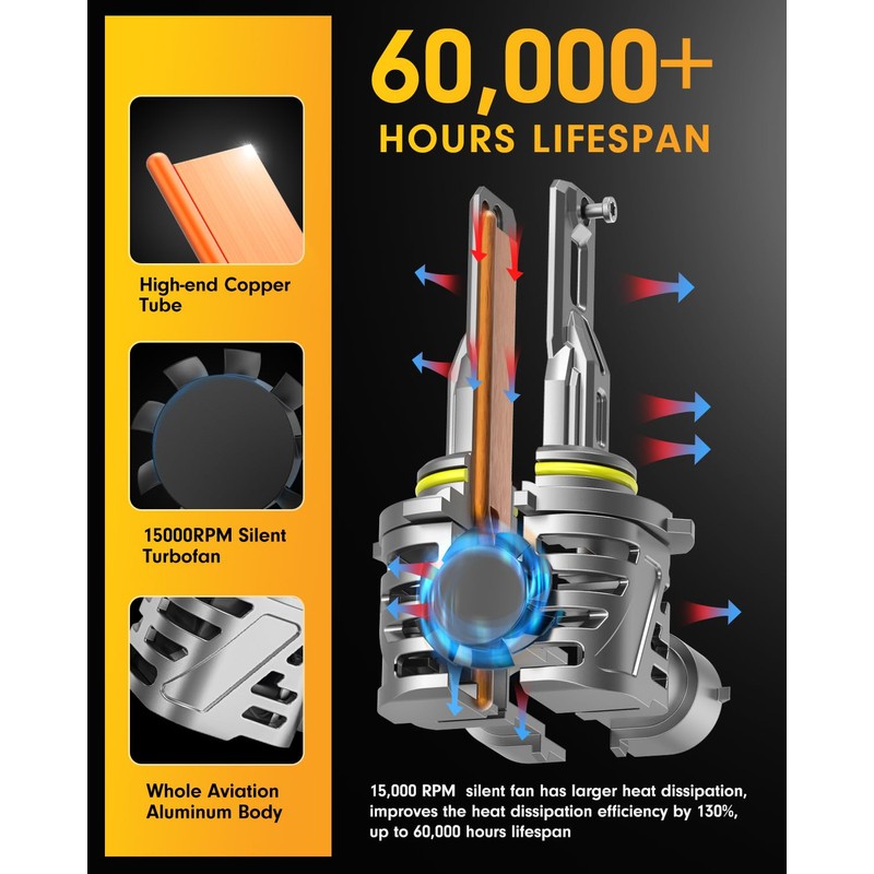 • 【15,000 RPM Silent Turbo Fan】9012 bulbs are paired with an 15,000 RPM mini silent turbo fan to ensure effective cooling at 800% brightness output. In addition, it is equipped with an aviation aluminum body and double copper tube copper plate, which can achieve a working life of more than 60,000 hours.