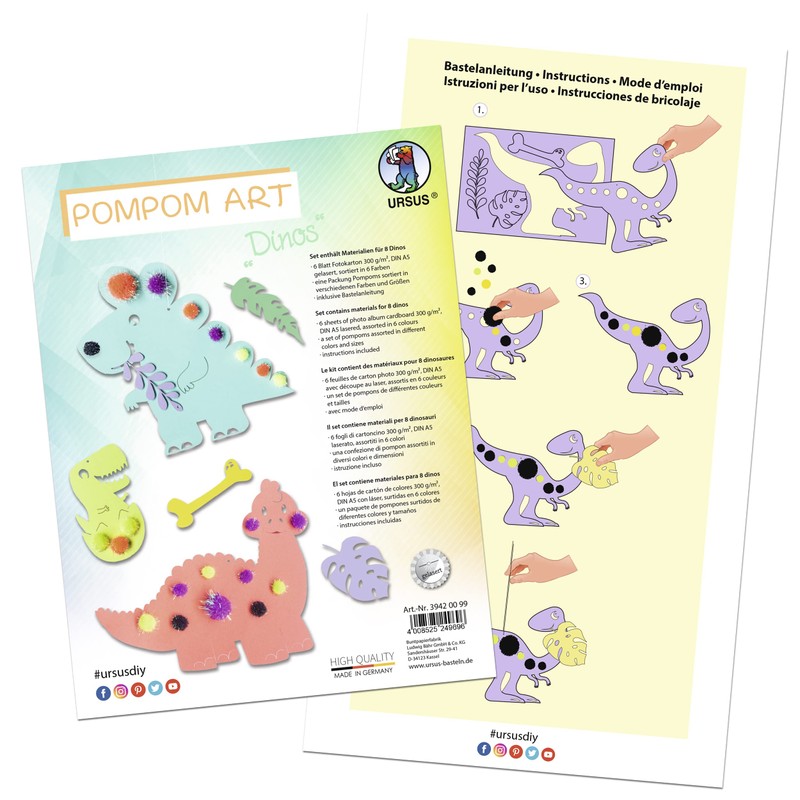 Ursus 43500009 Pompom Art Dinos, Craft Set with 6 Sheets of Photo Card Assorted in 6 Different Colours, DIN A4, 300 g/m², with Glittering Pompoms, for a Total of 8 Dinosaurs, Includes Craft