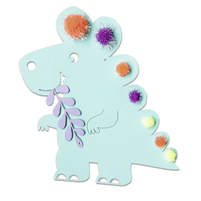- Contents: 6 sheets of photo card in 6 colours for 8 different dinosaur motifs, 1 bag of colourful glitter pom poms