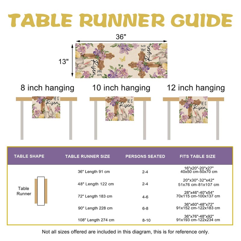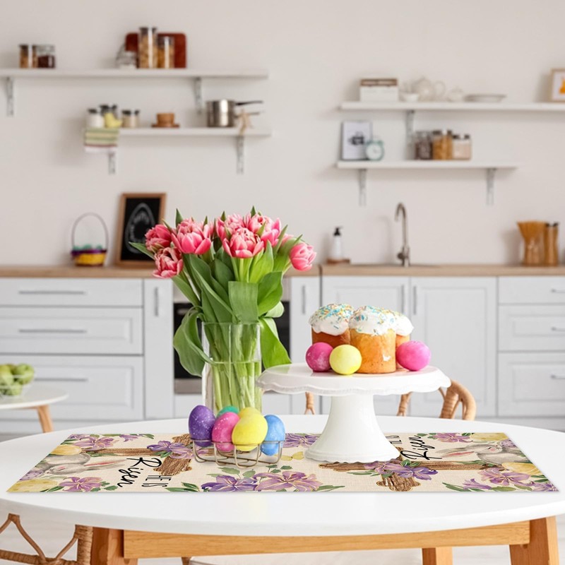 - Uniquely Designed Table Runner: Our Easter tabletop runner is designed with the current elements to add style and vibrancy to your home. Table runner is printed with vivid lily, cross, Easter eggs, bunny, butterfly patterns, which is the perfect decoration for Easter. Express your positive outlook on life by decorating your coffee table, dining table, buffet and kitchen with our seasonal table runners in a variety of themes