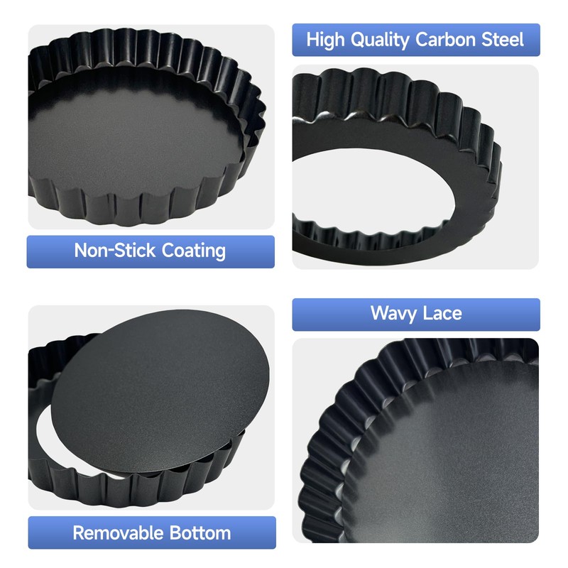 - NON-STICK TART PANS: These tart pans are made of heavy duty carbon steel material, non-stick, sturdy and smooth. These tartlet pans feature with fluted edges, which make pies baked evenly and provide you perfect crusts with ruffled edges.