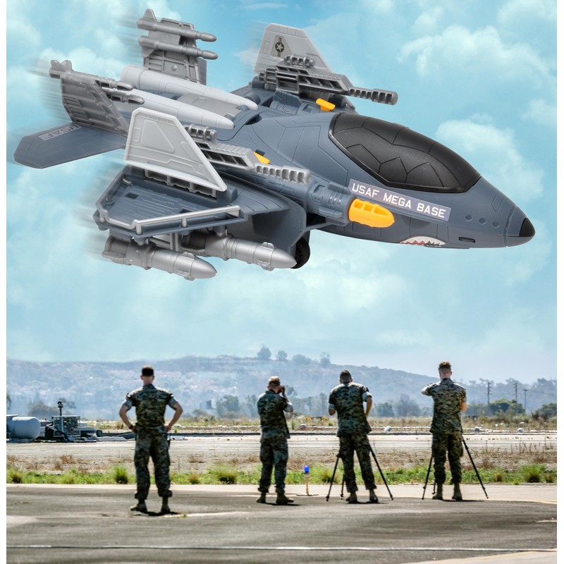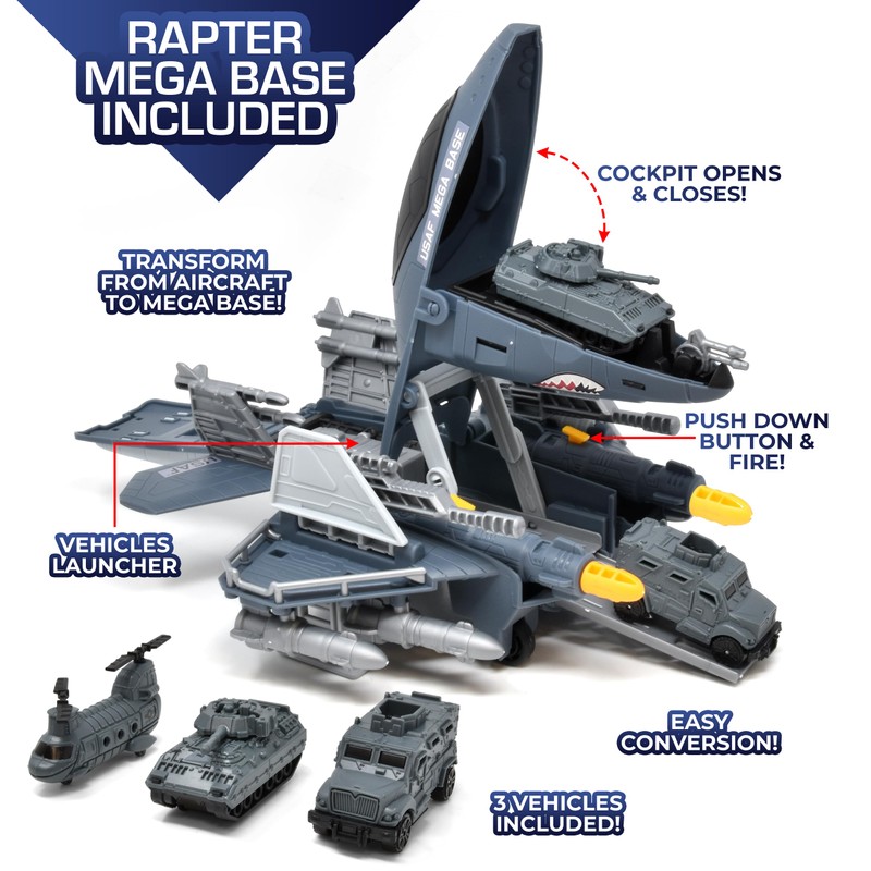 - United States Raptor Mega Base: Your air base includes a convertible airplane base that shoots missiles Complete with runways and three vehicles your little airman will be on a high