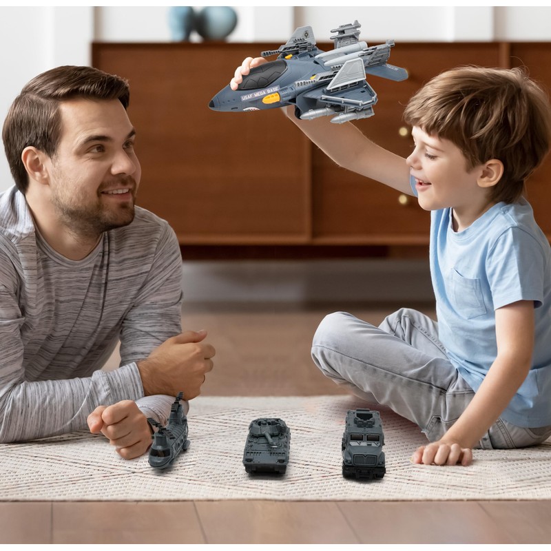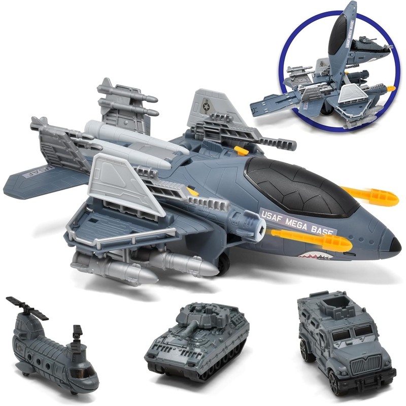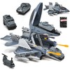 US Air Force Military Aircraft Carrier Toy Fighter Airplane, Raptor Mega Base with Vehicles Army Toy Shoots Missiles Convertible Jet with Helicopter for Kids
