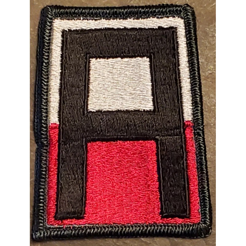 Description: On a background equally divided horizontally white and red, 3+1⁄4 inches high and 2+1⁄2 inches wide at base and 2+1⁄8 inches wide at top, a black block letter "A", 2+3⁄4 inches high, 2 inches wide at base and 1+5⁄8 inches wide at top, all members 7/16 inch wide, all enclosed within a 1/8 inch Army Green border.