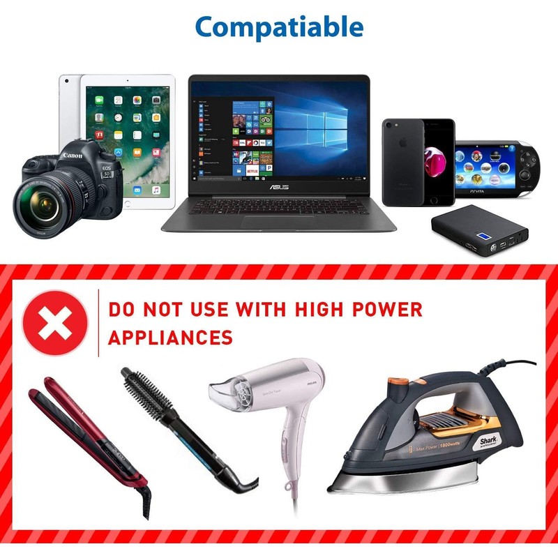 6) Power consumption: <2200 watts, not suitable for high power appliances, such as hair dryer, hair straightener, coffee machine, electric iron and toothbrush