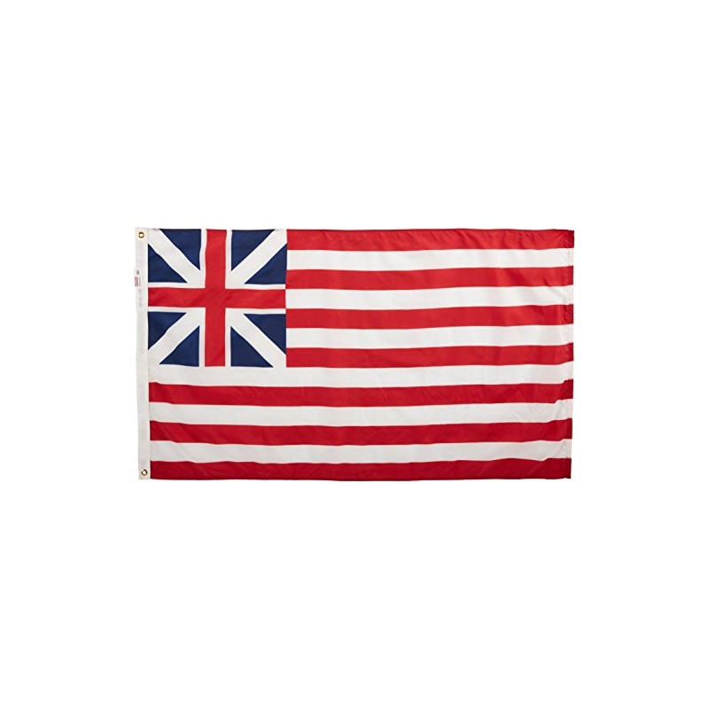 The Grand Union Flag 1775 is also known as the Continental flag, it is the first true U.S. Flag. It combined the British King's Colors and the thirteen stripes signifying Colonial unity. George Washington liked this design so well that he chose it to be flown to celebrate the formation of the Continental Army on New Years Day, 1776. On that day the Grand Union Flag was proudly raised on Prospect Hill in Somerville, near his headquarters at Cambridge, Massachusetts. This top quality 3'x 5' Continental flag made is in the USA by a leading flag company from durable heavyweight nylon. It is finished with a strong canvas heading and 2 brass grommets. Looks great indoors or outdoors.