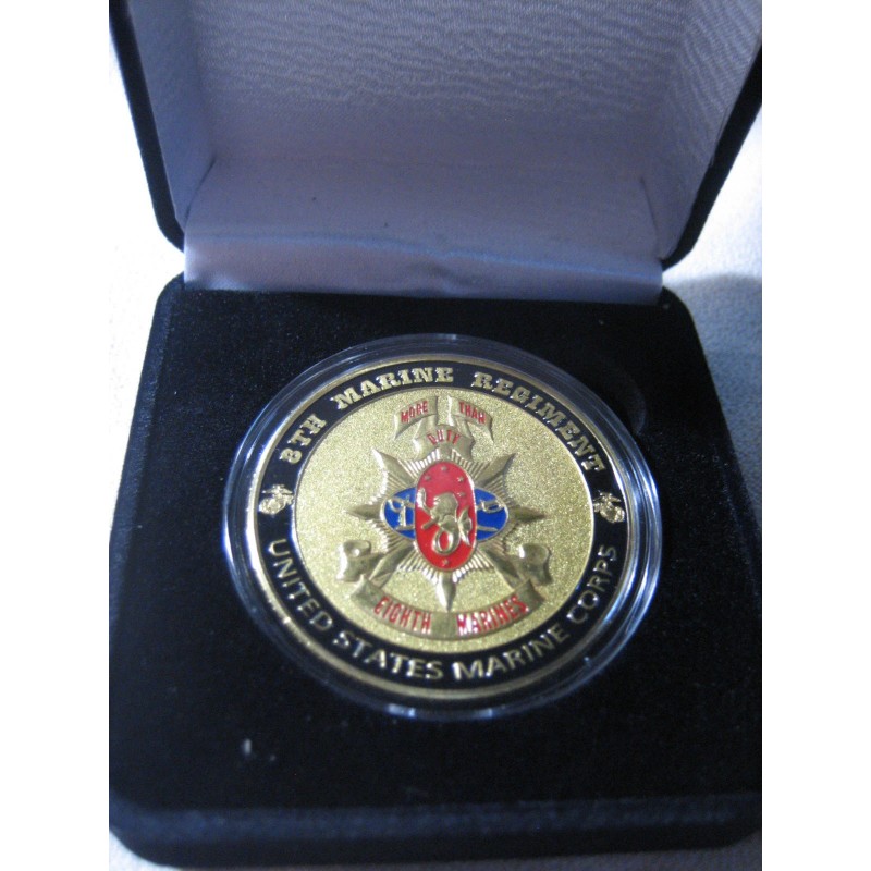 This is a great looking 8th Marine Regiment commemorative challenge coin. Coin is about 1 9/16" in diameter. This coin has a 8th Marine Regiment insignia on front in raised lettering and the Marine Corps logo on the reverse. Coin is contained in an acrylic air tight holder and displayed in an attractive black velvet presentation box which will make this a very impressive gift.
