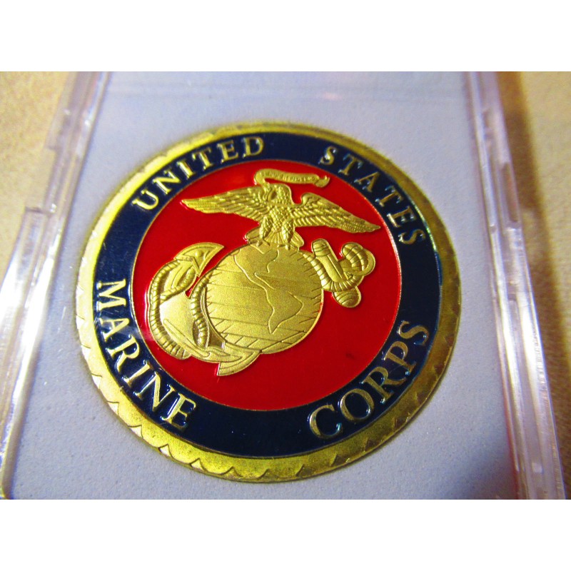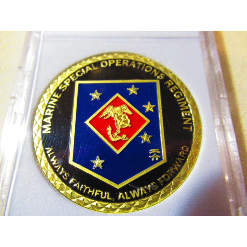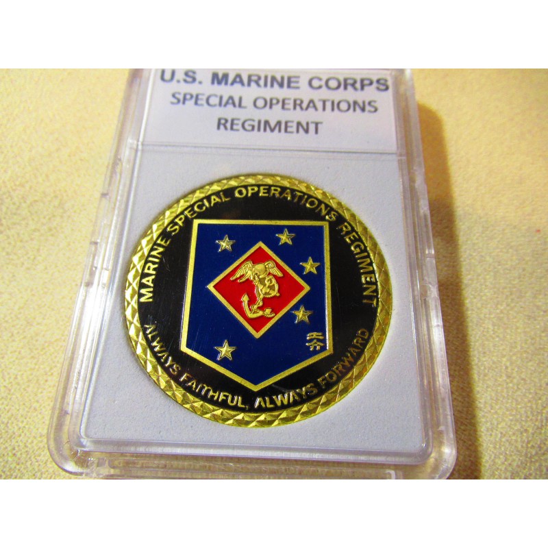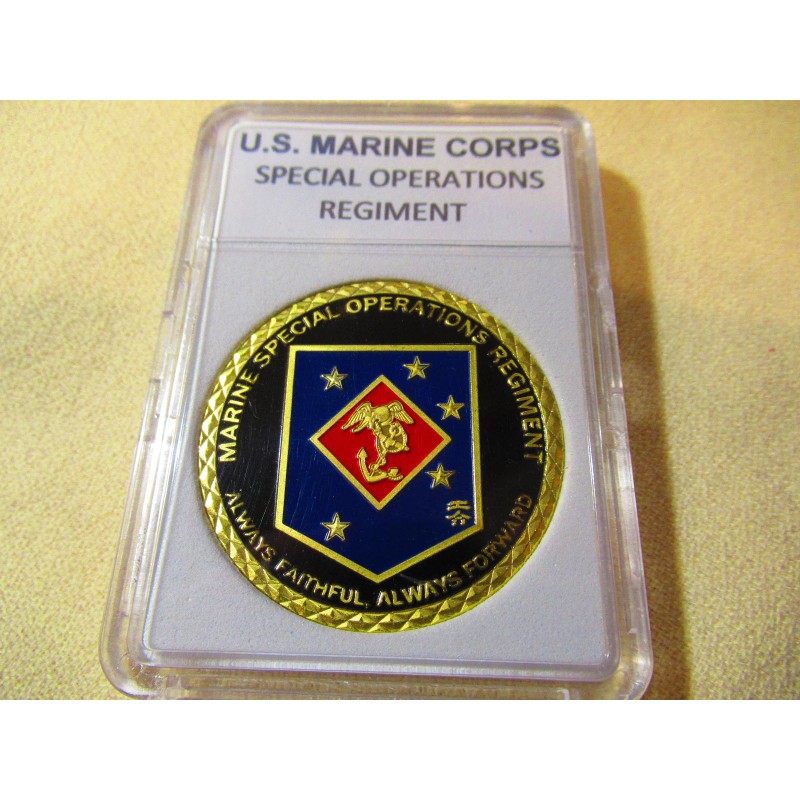 This is a great looking US MARINE CORP Special Operation Regiment commemorative challenge coin. Coin is about 1 9/16" in diameter. This coin has the regiment insignia on the front and a US Marine Corp gold plated raised logo on reverse side. Coin