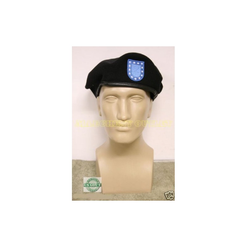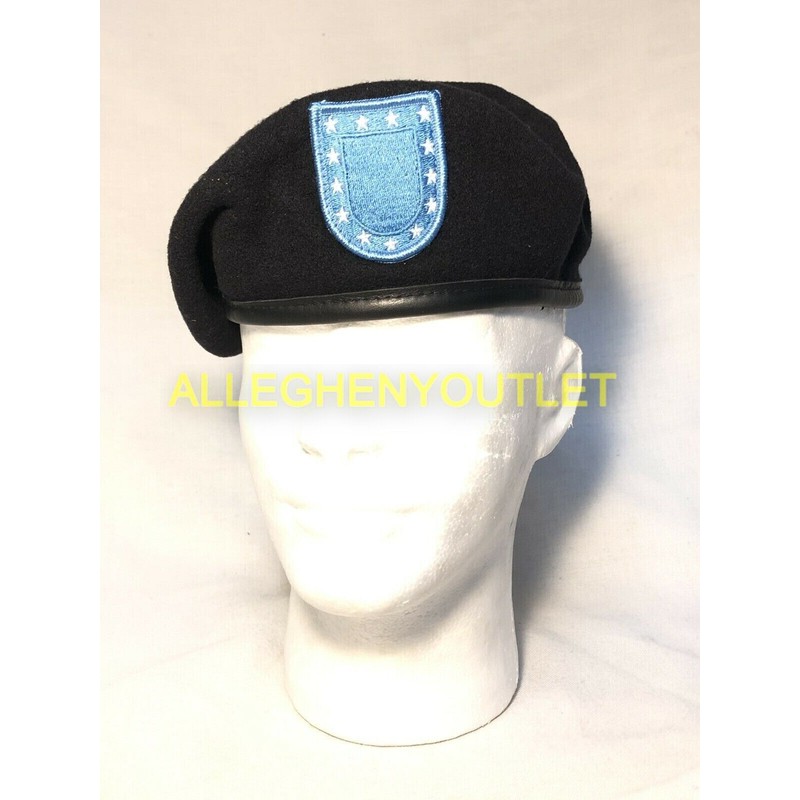 US Military Wool ASU Uniform Beret w/ Army Blue Flash Patch, Black, Size 8, NIB