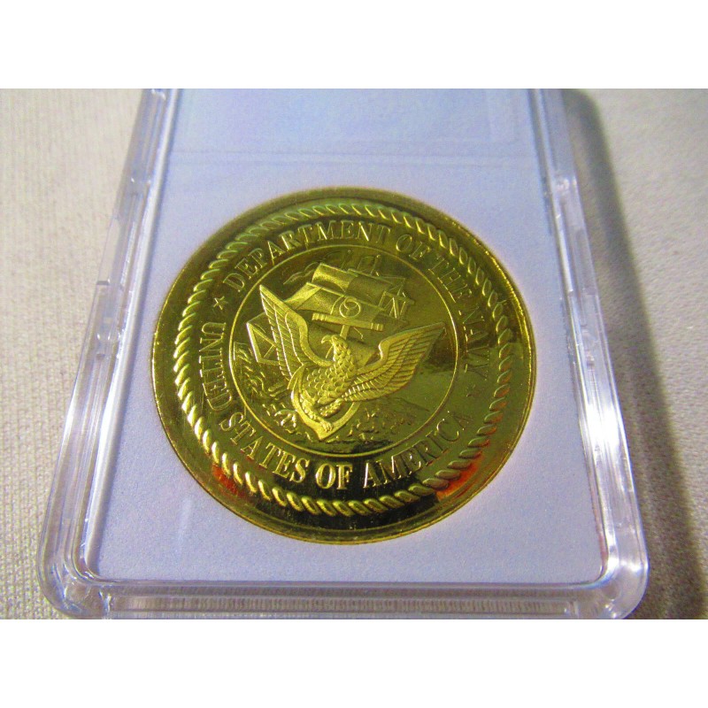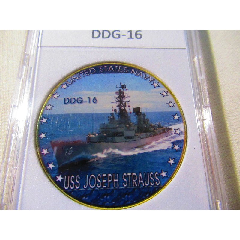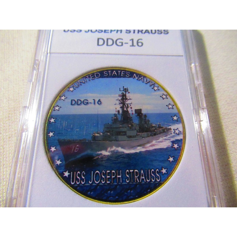 This is a great looking US NAVY - USS Joseph Strauss (DDG-16) challenge coin. Coin has reeded edges and is about 1 9/16" in diameter. Front side of coin is printed and colorized while the rear side is raised lettering and gold plated. Coin is contained in an acrylic air tight holder.