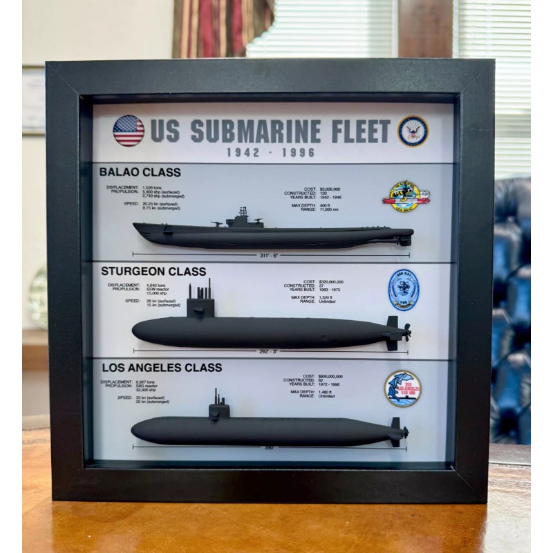 This unique memorial box (8.75 x 8.75) highlights the bread and butter of the US Submarine Fleet from 1942 to the present. The three classes in this shadow box memorial, represent the most populous classes of submarines built by the United States Navy. The Balao, Sturgeon and Los Angeles Class submarine represent the "backbone" of our submarine fleet through the second half of the twentieth century. This handcrafted display features three custom made 3D resin models of these submarines in addition to vital statistics of each class. Mounted in a black shadow box with a glass panel. This high quality wall piece is the perfect gift for any submariner or naval enthusiast. A smaller variation of this same display is also available in our shop.