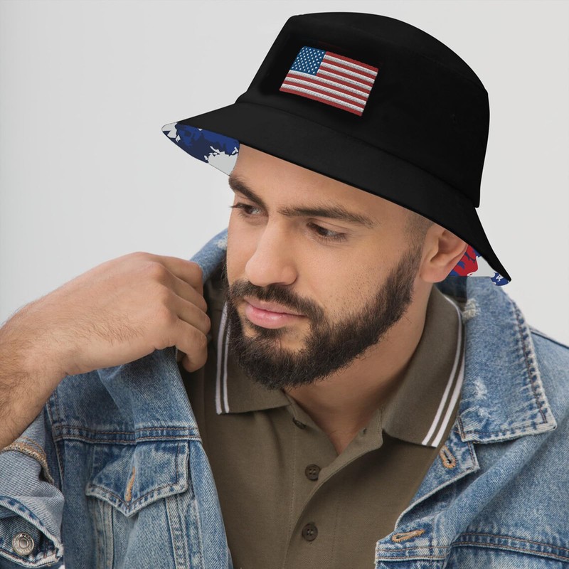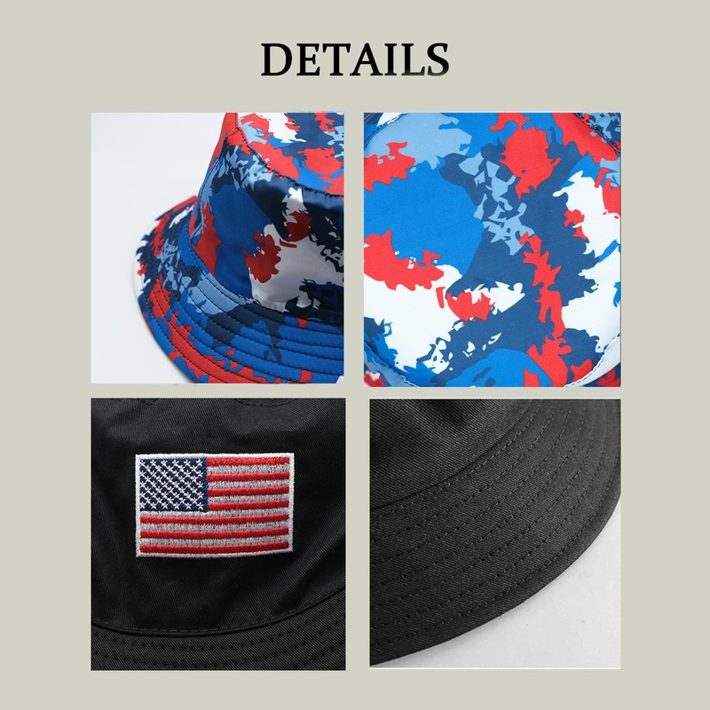 - Features: USA hat, patriotic hat, black American flag hat, red white and blue bucket hat for unisex, flag embroidered fishing hat, fourth of july hat, 4th of july bucket hat,independence day hat, cute summer sun hat,womens party hats fashion, reversible double side wear,one side is covered with usa flag,the other side is a simple red blue white camouflage with usa map print,you can easy match it according to your outfit.