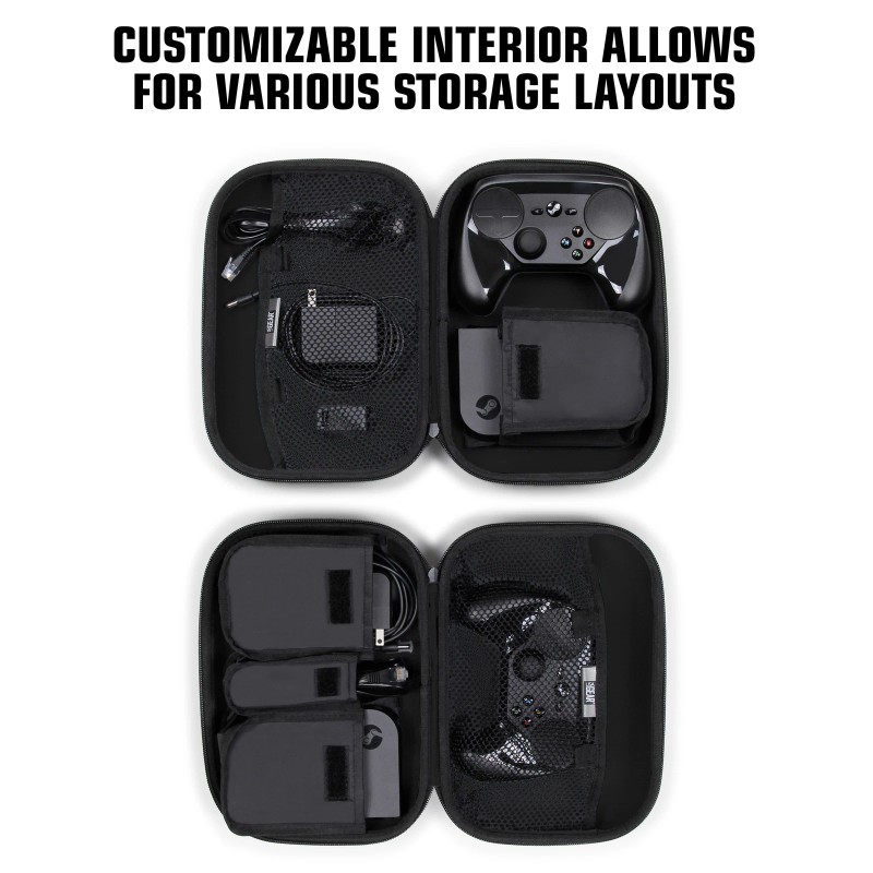 <b>Hard Shell Steam Link and Steam Controller Case by USA Gear<p>Rugged Protection</b><br>Constructed from a durable hard shell exoskeleton with weather-resistant Nylon, this case is ready for anything. And to provide that extra peace of mind, the case also features a scratch-resistant interior lining that keeps everything within secure and cushioned. Get a case that provides protection from within and from without, so you never need to worry about your gear.<p><b>Smart , Versatile Design</b><br>Put your Steam Link and Steam Controller in one organized place AND protect them from damage! The interior features three removable, customized storage compartments for all device-related accessories, such as adapters, charging cables and more. The inside also contains a velcro mesh side pocket for storing your Steam Controller and other larger devices that won’t fit in some of the more compact pockets. Take it with you on the road, off the road, and everywhere in between to give your devices the ultimate protection.<p><b>WORKS WITH:</b><p>Steam Link<p>Steam Controller