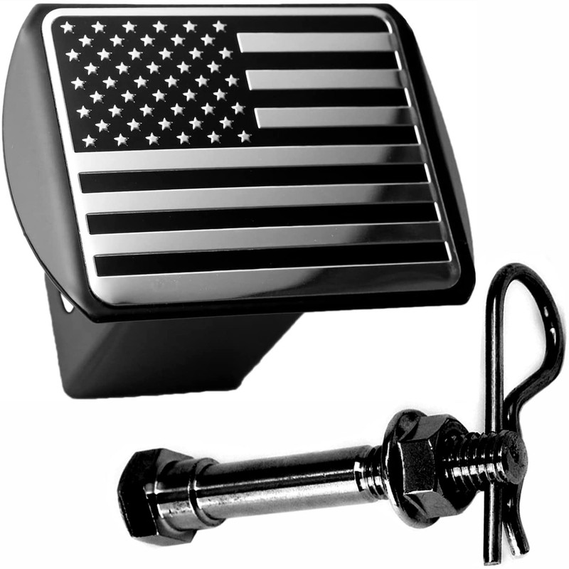USA US American Flag Black Chrome Trailer Metal Hitch Cover with Stainless Steel Anti-Rattle Pin Bolt, Fits 2" Receivers