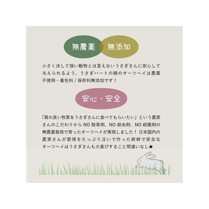 - Rabbits Grass Dried Oat Hay It is too delicious, so you can bite. Eats a lot and is full of large poops! No pesticides, no coloring agents, no preservatives: The green oathay of the rabbit heart is pesticide free and additive-free