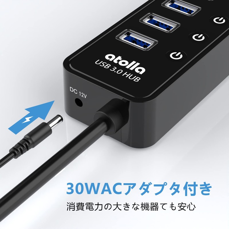 The atolla USB Hub with Power offers 10 external USB 3.0 expansion ports to easily connect up to 10 USB devices such as keyboards, mice, printers, flash drives, etc.
