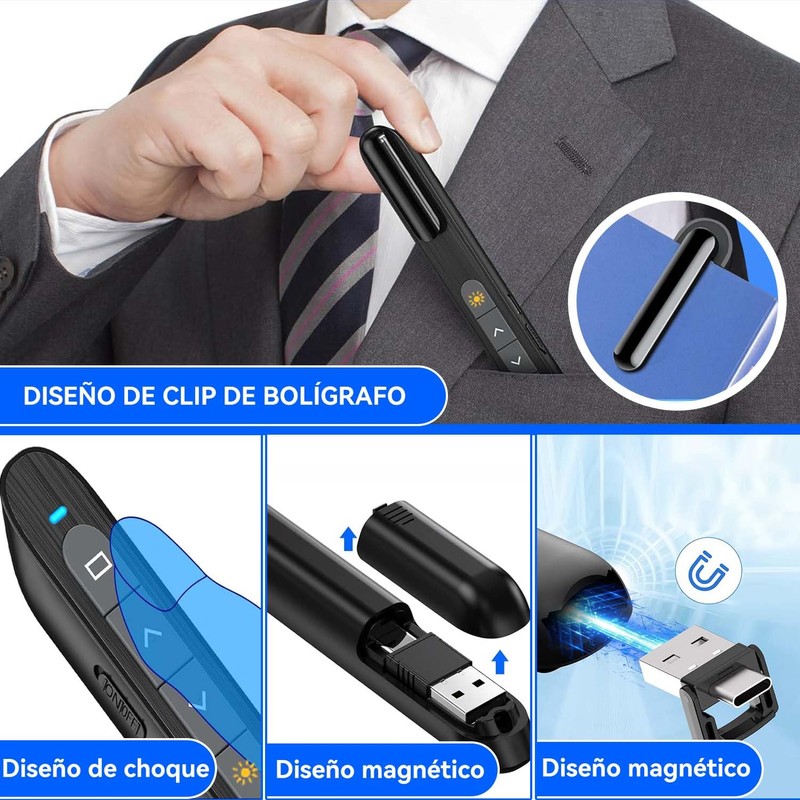 - Diseño 2 en 1 USB y tipo C: con un diseño único de doble cabezal, puede usar este control remoto de presentación en computadoras con interfaces USB C y USB 2.0, compatible con la mayoría de los dispositivos, como computadoras portátiles con iPad. Este clicker de presentador Diapositivas es fácil de usar, no requiere descarga de software, solo conéctelo y listo. El clip del control remoto inalámbrico recargable del presentador es como un bolígrafo, lo que le permite sujetarlo a su bolsillo o libro para colocarlo fácilmente y evitar pérdidas, y el diseño curvo le brinda un agarre más cómodo.