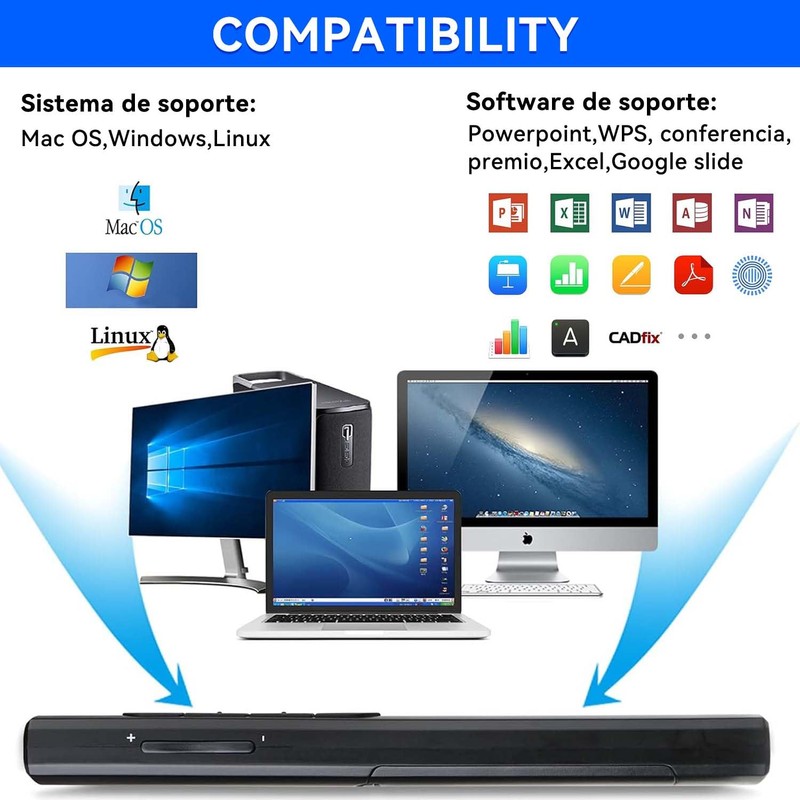 - Amplia compatibilidad: el clicker para presentaciones de PowerPoint tiene control remoto inalámbrico RF de 2,4 GHz. El clicker inalámbrico para presentaciones Plug & Play se puede utilizar para MS Word, Excel, PowerPoint, ACD See, iWork (Keynote y Numbers and Pages) y Google Slide compatible con Windows Linux, Mac. Sistema operativo, Android.