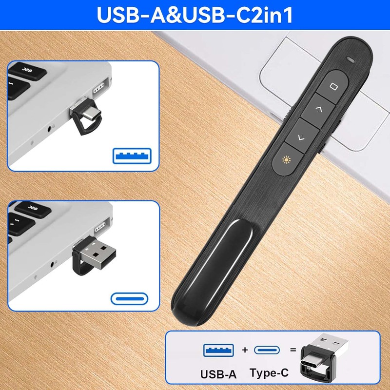 USB-C/A 2 En 1 Presentador Inalámbrico para Diapositivas,Control Remoto para Presentaciones,Plug & Play,Diapositivas,Bolígrafo para pasar página, Compatible con Windows, Mac,PowerPoint,Prezi y más