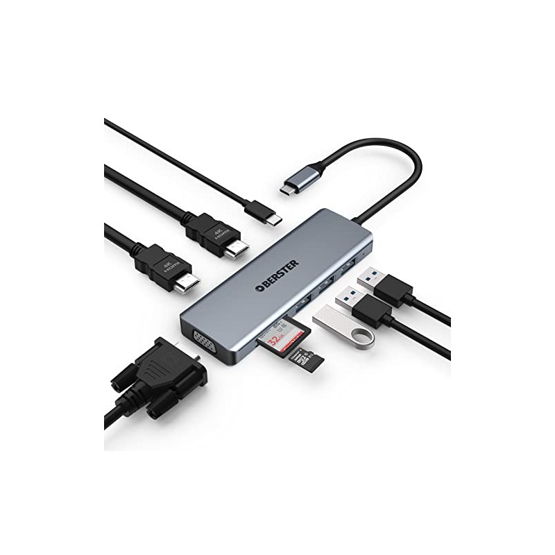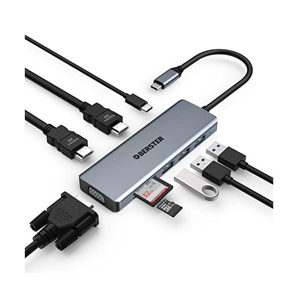 USB C Hub Dual HDMI Adapter, OBERSTER 9-in-1 Triple Display Docking Station 4K HDMI with Collage Display Mode, VGA, 100W PD, 3 USB 3.0 and TF/SD Card Compatible with MacBook and Windows