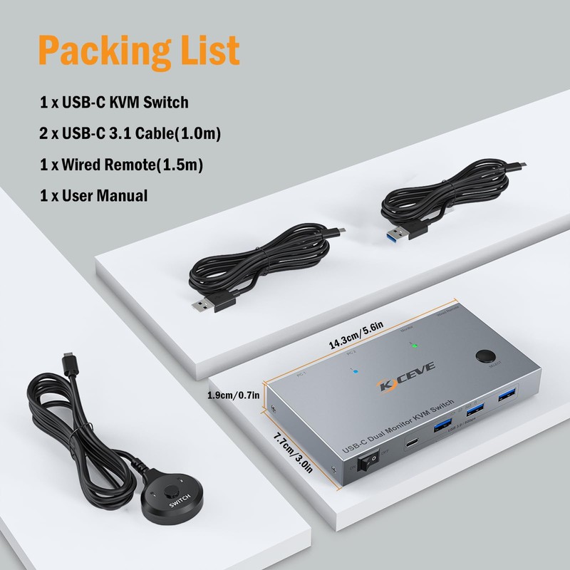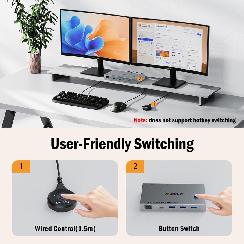 USB-C KVM Switch, 8k@60HZ KVM Switch 2 Monitor 2 Computers for 4 USB Devices, 2 Port Switch Selector with Wired Control and Power Adapter