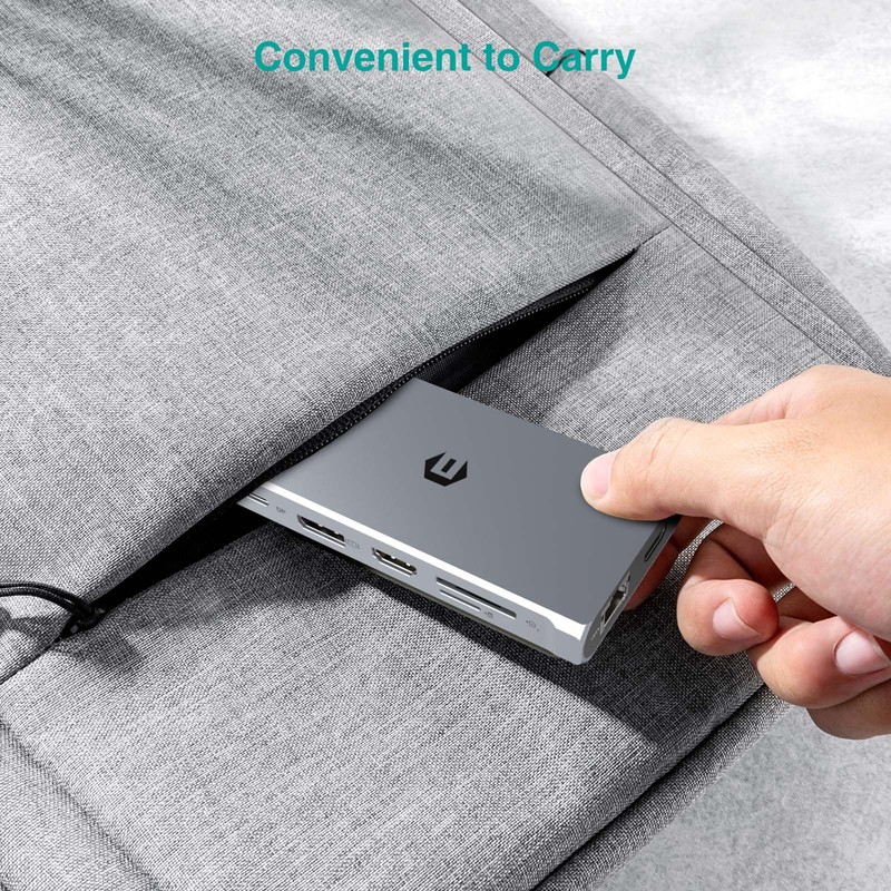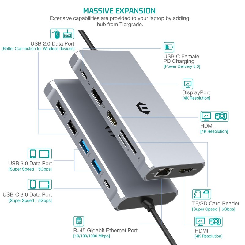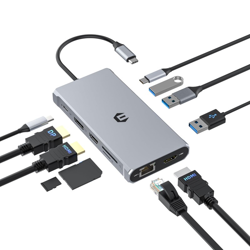 - Massive Docking Station: Before your purchase, please ensure the USB-C port of your laptop supports video output or Display Alt mode, which decides the HDMI ports & DP port work or not. 12 in 1 USB C Hub turns a single USB-C port into 2 HDMI 4K port, 1 Display Port, 2 USB 3.0 ports, 2 USB 2.0 ports, 1 Type C USB 3.0 data port, 1 USB-C 100W charging port, 1000M RJ45 Ethernet Port, and SD & TF 5Gbps card reader